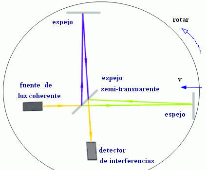 Tras el sorprendente resultado del experimento de Airy, el físico Albert Michelson ideó un ingenioso aparato con el objetivo de evidenciar de manera definitiva el presunto movimiento de la Tierra a través del éter. En el diagrama de arriba podemos ver de manera esquemática los principios del llamado “Interferómetro de Michelson”. Se emite luz coherente amarilla desde un foco, parte de ella se desvia hacia un espejo (trazo azul), y parte sigue hasta el otro espejo (trazo verde) situado a igual distancia. Los haces de luz procedentes de ambos espejos convergen en el detector, pero las distancias recorridas no son las mismas (el espejo de la derecha se mueve, con la totalidad de la Tierra, a velocidad v = 30 km/s [1], y acorta la distancia), por tanto, al no estar sincronizados producirán franjas de interferencia. Evidentemente, para medir variaciones tan pequeñas, los espejos deberían estar situados a distancias invariables, algo casi imposible de lograr pues una levísima vibración del suelo perturba estas distancias. Sin embargo, al hacer rotar un cierto ángulo α toda la plataforma se podría contrarrestar los retardos por errores instrumentales o por perturbaciones externas. No se trataba, entonces, tanto de detectar franjas de interferencia, como de observar el desplazamiento de estas franjas al hacer girar el aparato. Si la tierra se movía respecto al éter el aparato estaba ciertamente capacitado para detectarlo.